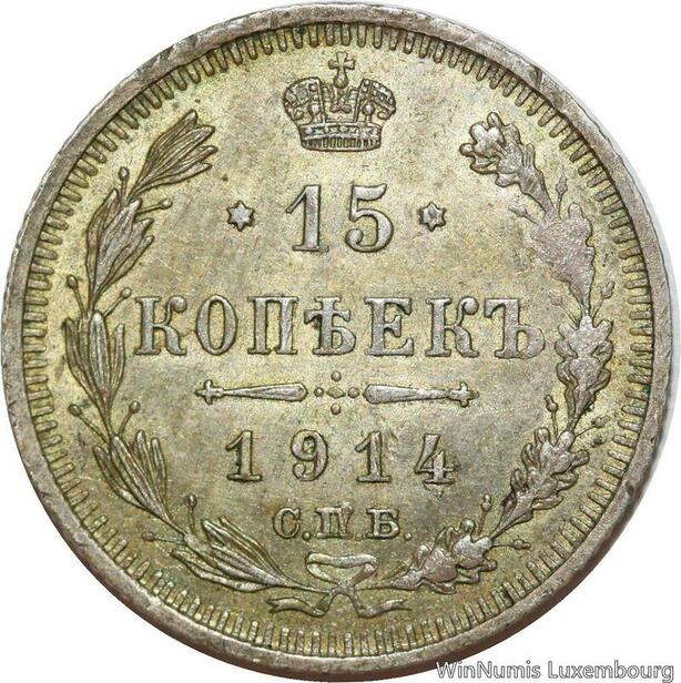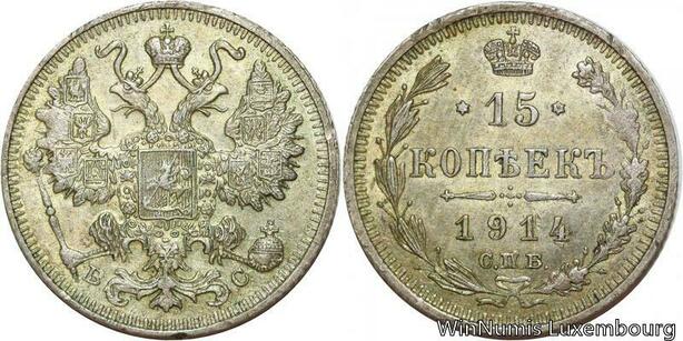 R9406 Rare Russia 15 Kopeks Nicholas II 1914 BC St Petersburg Silver UNC ->Offer