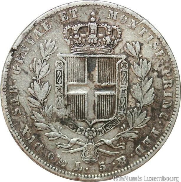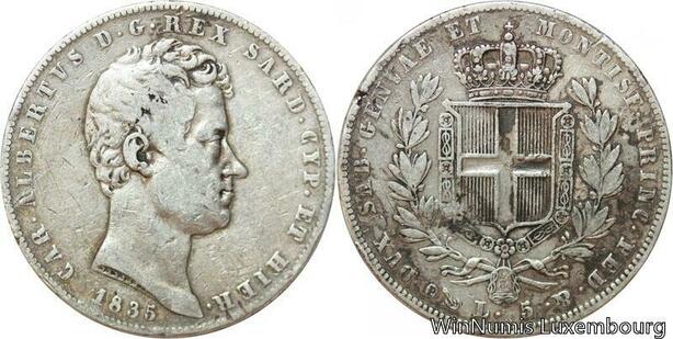 R9410 Rare Italy 5 Lire Carlo Alberto 1835 Genova Sardegna Silver-> Make offer