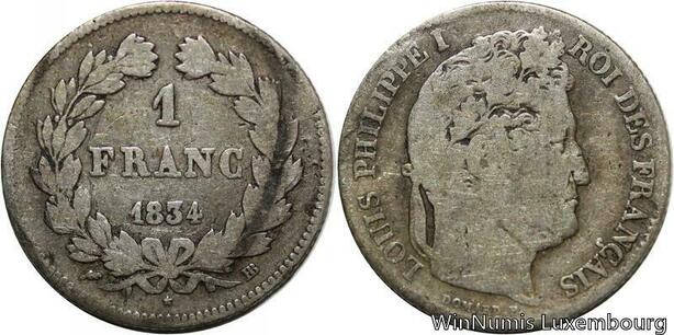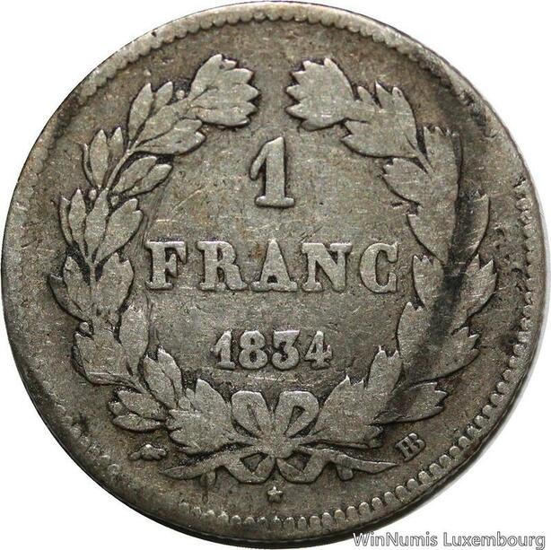 R9529 1 Franc Louis Philippe 1834 BB Strasbourg Argent Silver -> Make offer