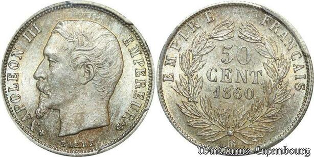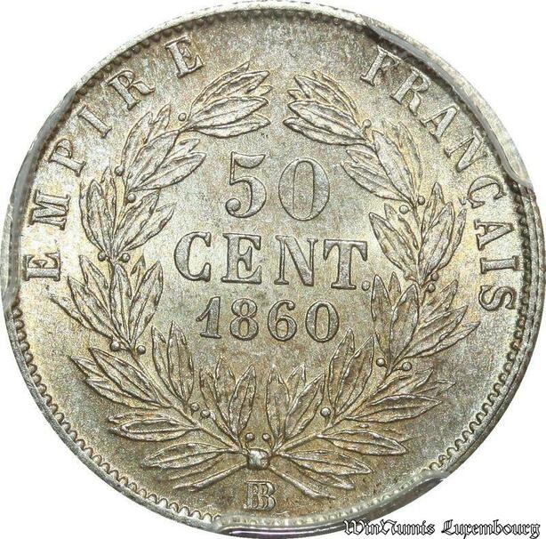 S7959 Très Rare ! Finest50 Centimes Napoléon I 1860 BB PCGS MS64 FDC