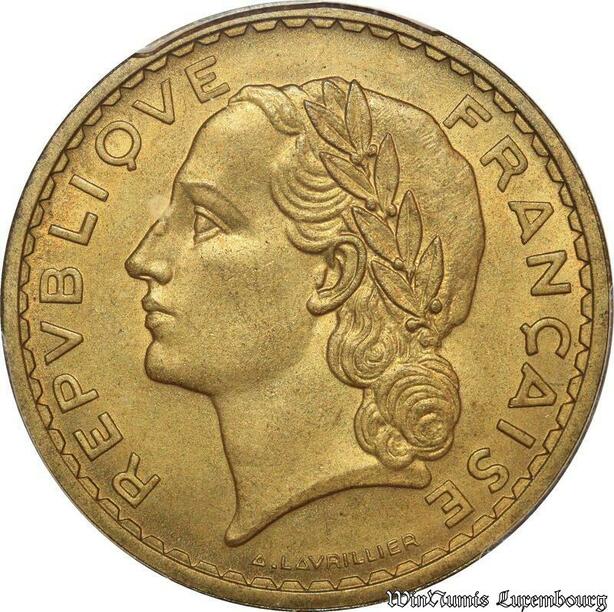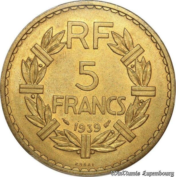 S8772 Rare France 5 Francs Essai LavrillI 1939 PCGS SP65 Bonze AluminiumFDC !