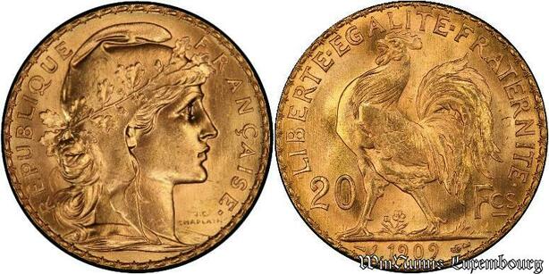 AA795 France 20 Francs Coq Marianne Diverses Years 1909 Or Gold AU Quality