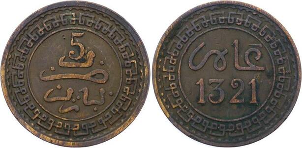 O2689 Morocco 5 Mazunas Abd al-Aziz 1321/1903 Y#16.3 Paris ->Make offer