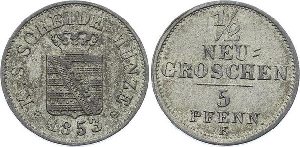 O2959 German States Saxony-Albertine 1/2 Neu Groschen 5 Pfenning Friedrich August II 1853 F UNC
