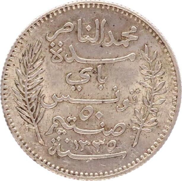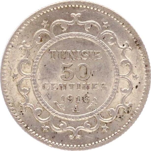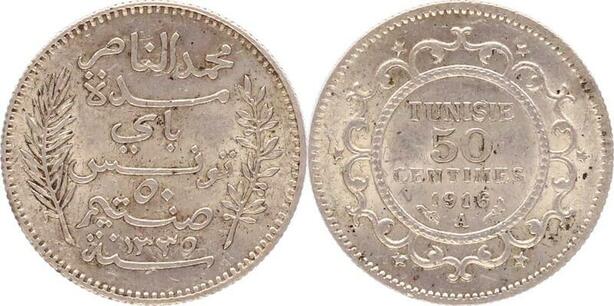 O127 Tunisie 50 Centimes Muhammad Al-Nasir 1916 A Paris Argent Silver SUP