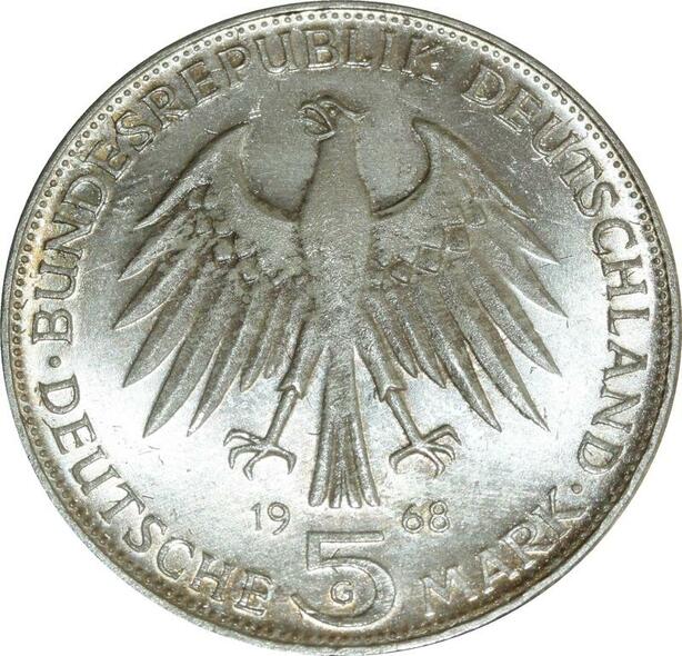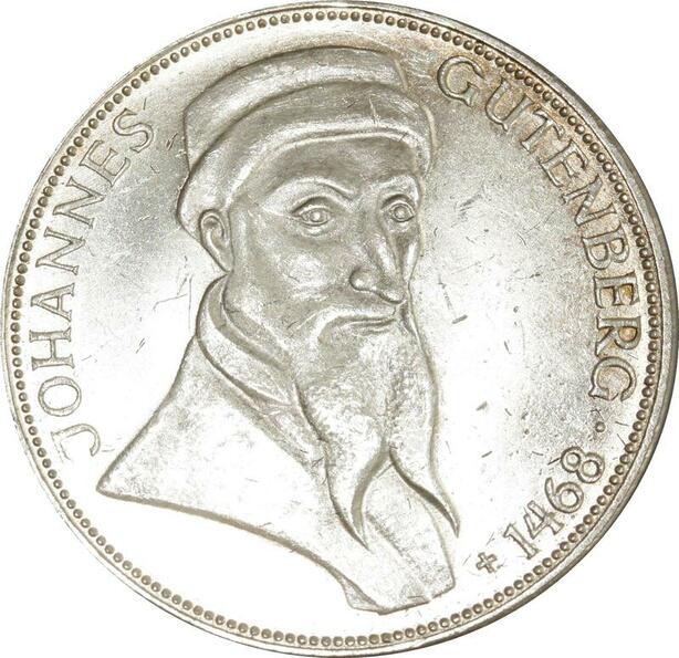 O421 Germany 5 Deutsche Mark Johannes Gutenberg 1968 G Karlsruhe Argent Silver UNC