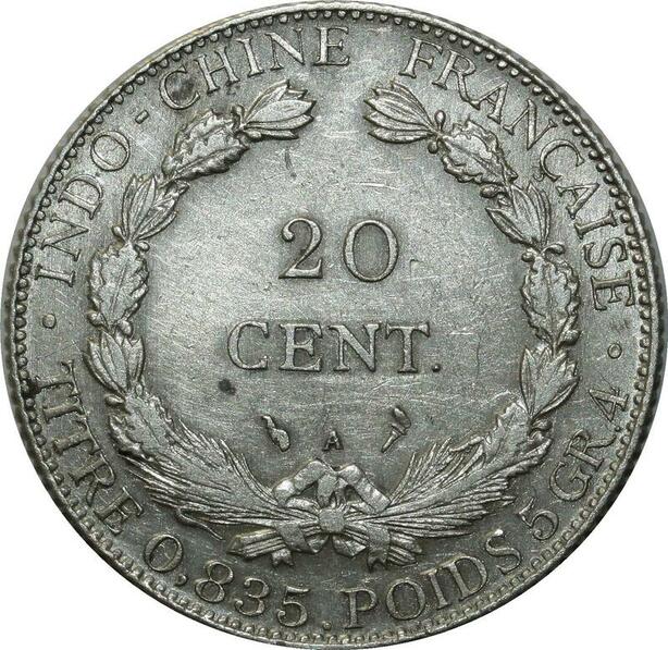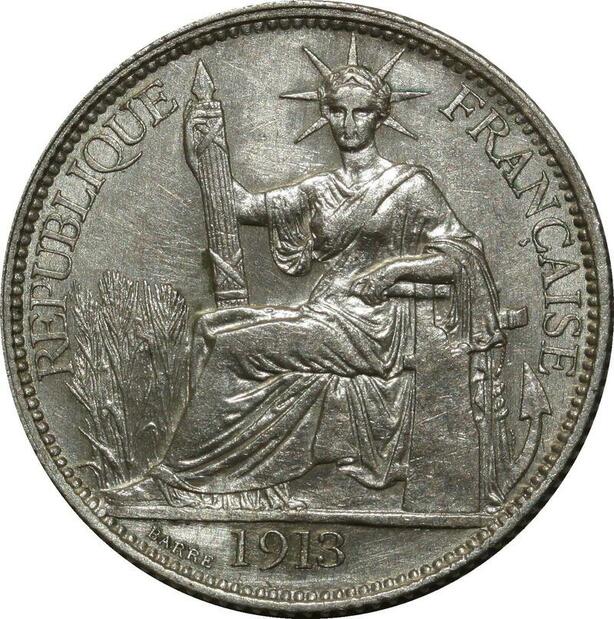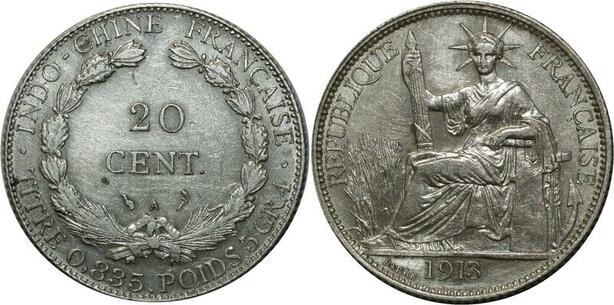 O592 Scarce French Indochina 20 Cents 1913 A Paris Silver XF to AU