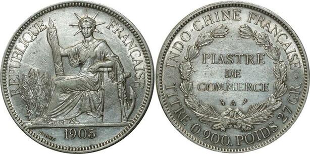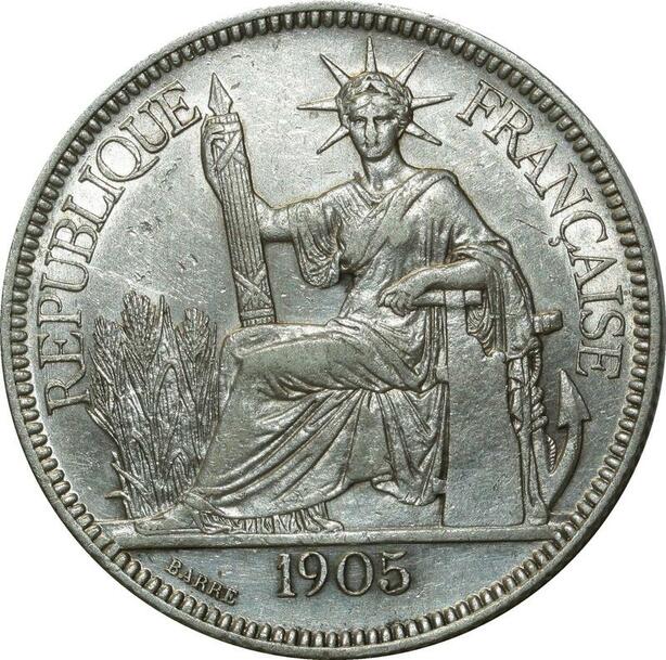 O674 Indochina 1 Piastre 1905 A Paris Argent Silver AU !!