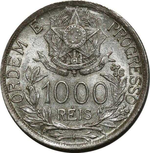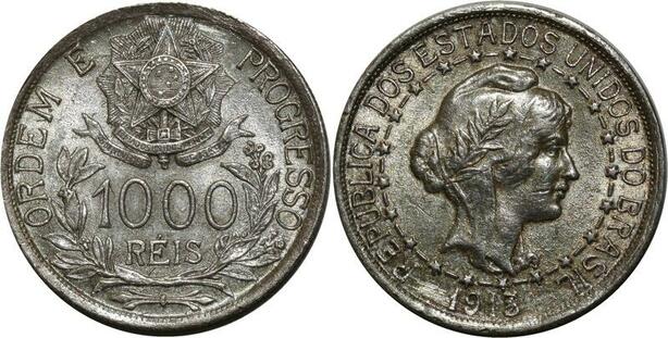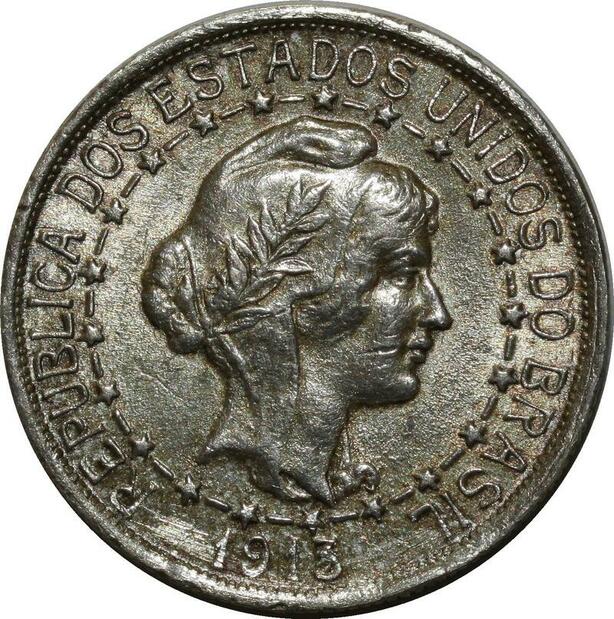 O942 Brazil Brésil 1000 Reis Liberty 1913 Silver AU