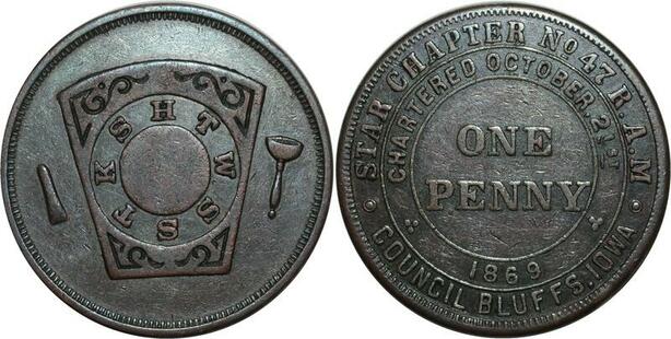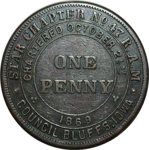 O1065 USA Masonic Token Franc Maçons One Penny 1869 Star Chapter Iowa N°47