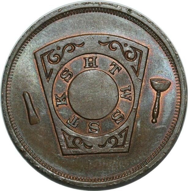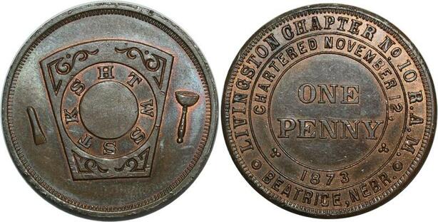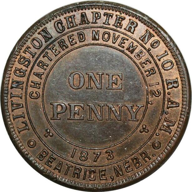 O1067 Scarce USA Masonic Token Franc Maçons One Penny 1873 Nebraska UNC Red