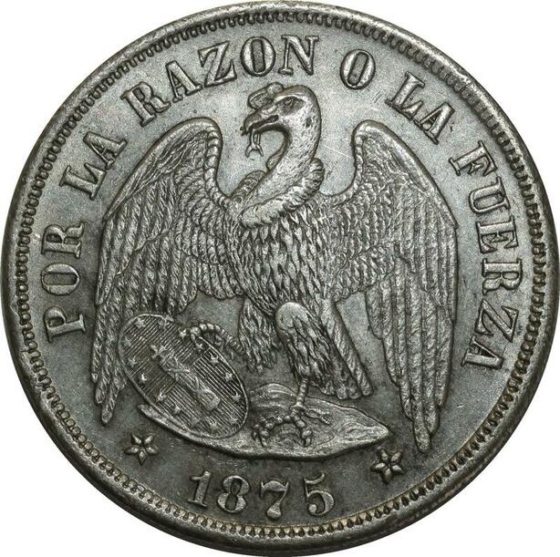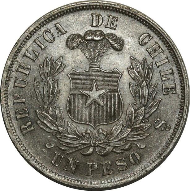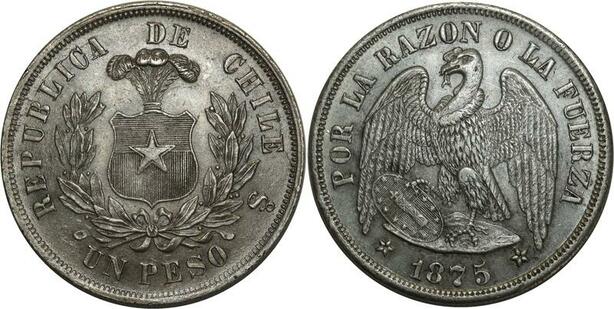 O1085 Scarce Chile Chili Republic Peso 1875 SO Santiago mint Silver UNC !!