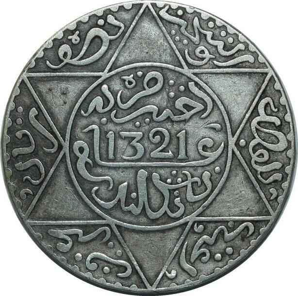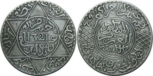 O1378 Morocco Abd al-Aziz 5 dirhams 1321 AH 1903 Londres Silver