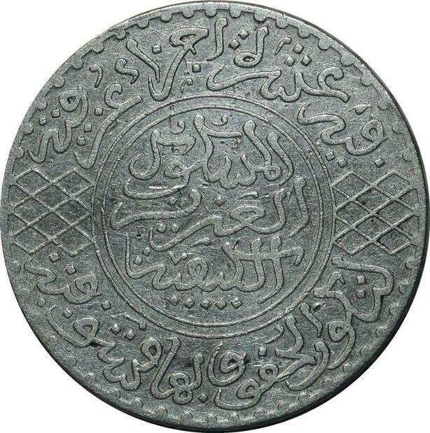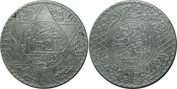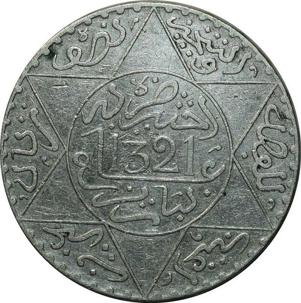 O1385 Rare Morocco Abd al-Aziz 5 dirhams 1321 AH 1903 Paris Silver