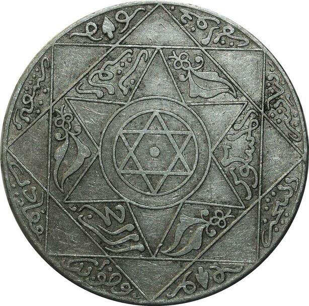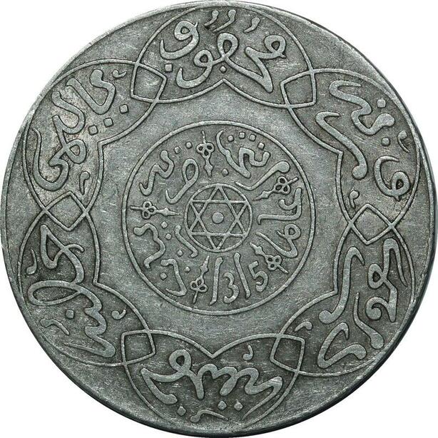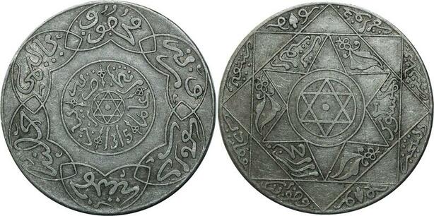 O1387 Morocco Hassan I 5 dirhams AH 1315 (Paris) 1897 Silver