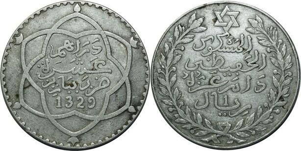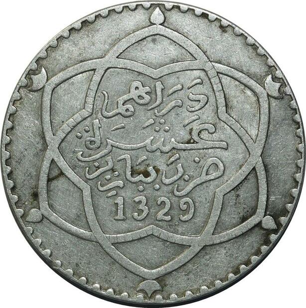 O1393 Rare Morocco Moulay Hafid I 10 dirhams 1329 Paris Silver AU
