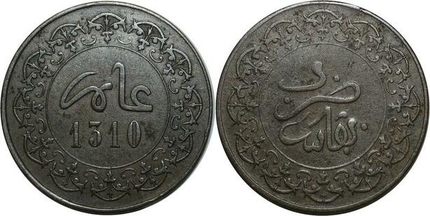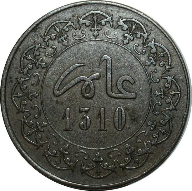 O1442 Scarce Morocco 5 Mazunas 2 Falus Moulay al-Hasan I 1310 AH Fez