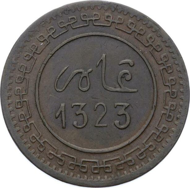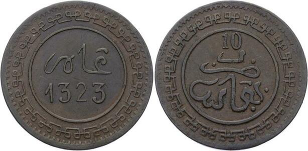 O1669 Scarce Morocco 10 Mazounas 1323 Fes Large Letter XF +++ KM $275