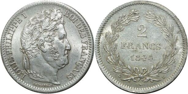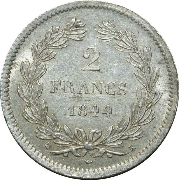 O1857 France Très Rare 2 Francs Louis-Philippe 1844 K Bordeaux Silver PCGS MS 62 CI