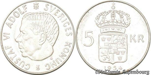 S8129 Sweden 5 Kronor Gustav VI Adolf 1954 Argent