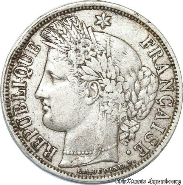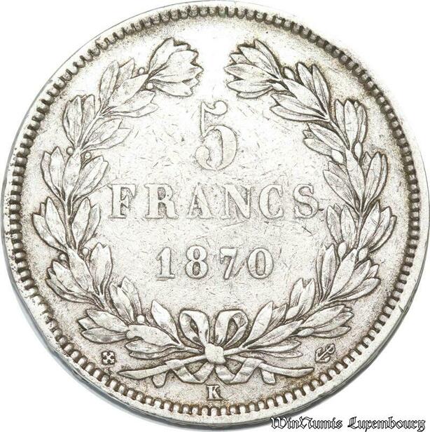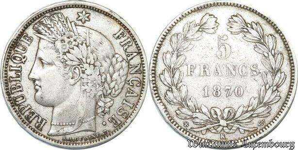 S8214 Rare France 5 Francs Ceres 1870 K Bordeaux Ancre Argent Silver TB+++