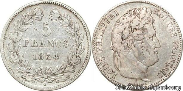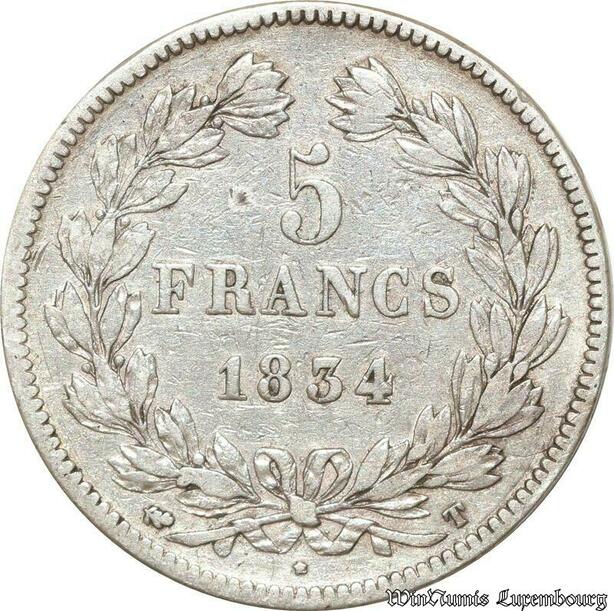 S9887 France 5 Francs Louis Phillippe I Domard 1834 T Nantes Argent Silver