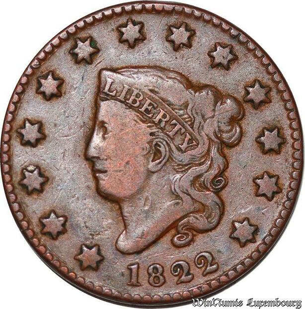 S6027 Rare Scarce USA 1 Cent 1822 Coronet Head