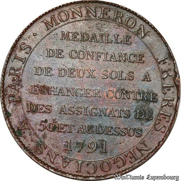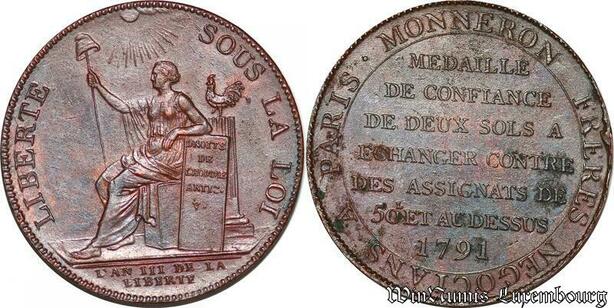 S6121 France Constitution 2 Sols Frères Monnerons 1792 Paris A AN3 superbe
