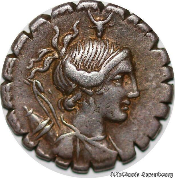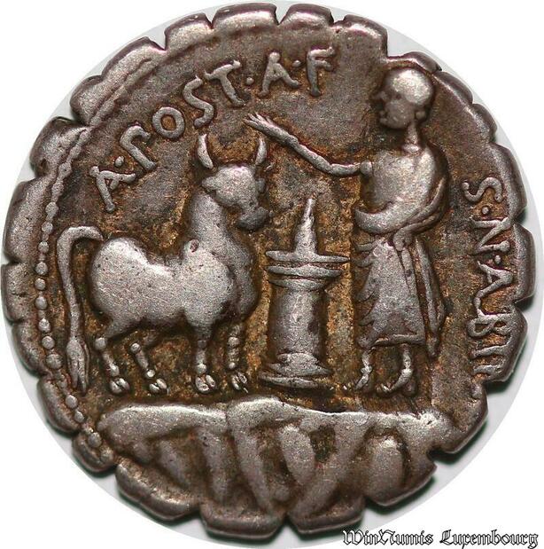 S6280 Roman Empire Rare Postumia 81 avant J-C Denier Seatus AFSN/ AL BIN Tête Diane Silver